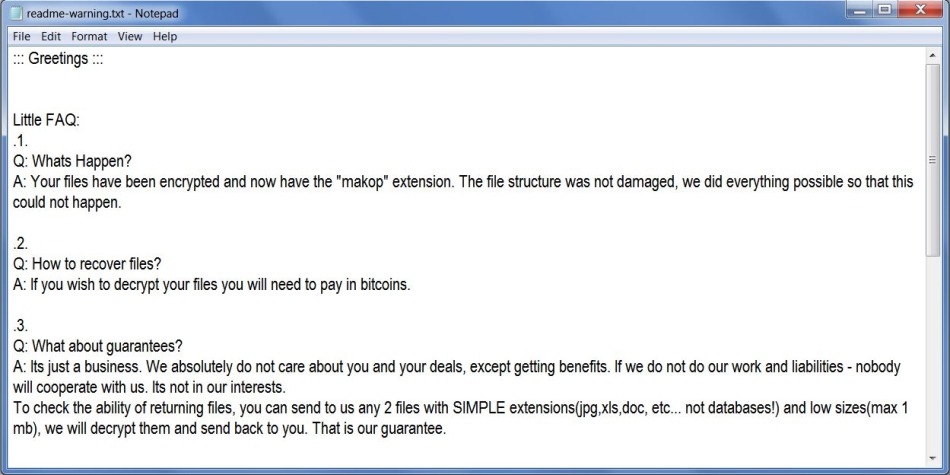 加密完成后,您所有带有[XXXXX].[makop@airmail.cc].makop扩展名的文件将不可用。要将您的文件恢复到初始状态,您需要以比特币支付赎金。网络犯罪分子在受害者计算机上留下的readme-warning.txt文件中描述了更详细的信息。为了证明他们真的可以解密文件,网络犯罪分子提供了几个文件的免费解密。在感染阶段的最后阶段,此勒索软件可能会删除您计算机上的所有卷影。