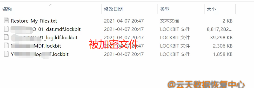 2021年6月30日,我公司接上海某公司求助电话,该公司服务器被攻击,所有SQL SERVER数据库的MDF文件都被勒索病毒加密。如下图: