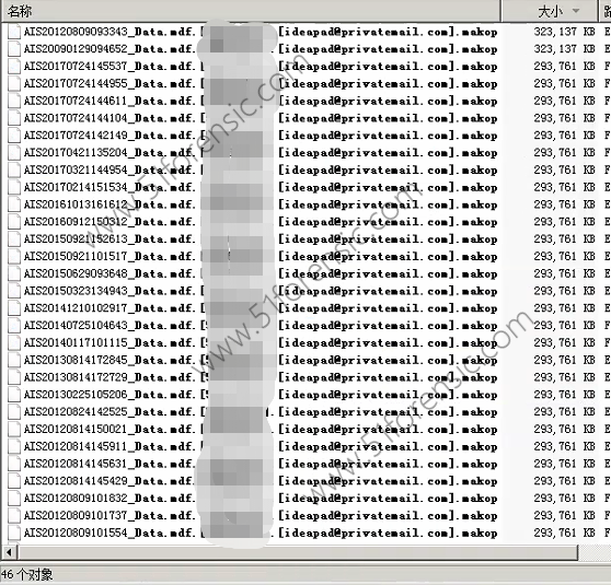 2021年10月19日,我司接到上海某集团的求助电话,称其金蝶财务系统被黑客攻击,所有账套数据都被加密。在原始文件名的基础上加了 [ideapad@privatemail.com].makop的后缀。客户需要我们将账套的数据恢复过来,时间也比较紧。如图: