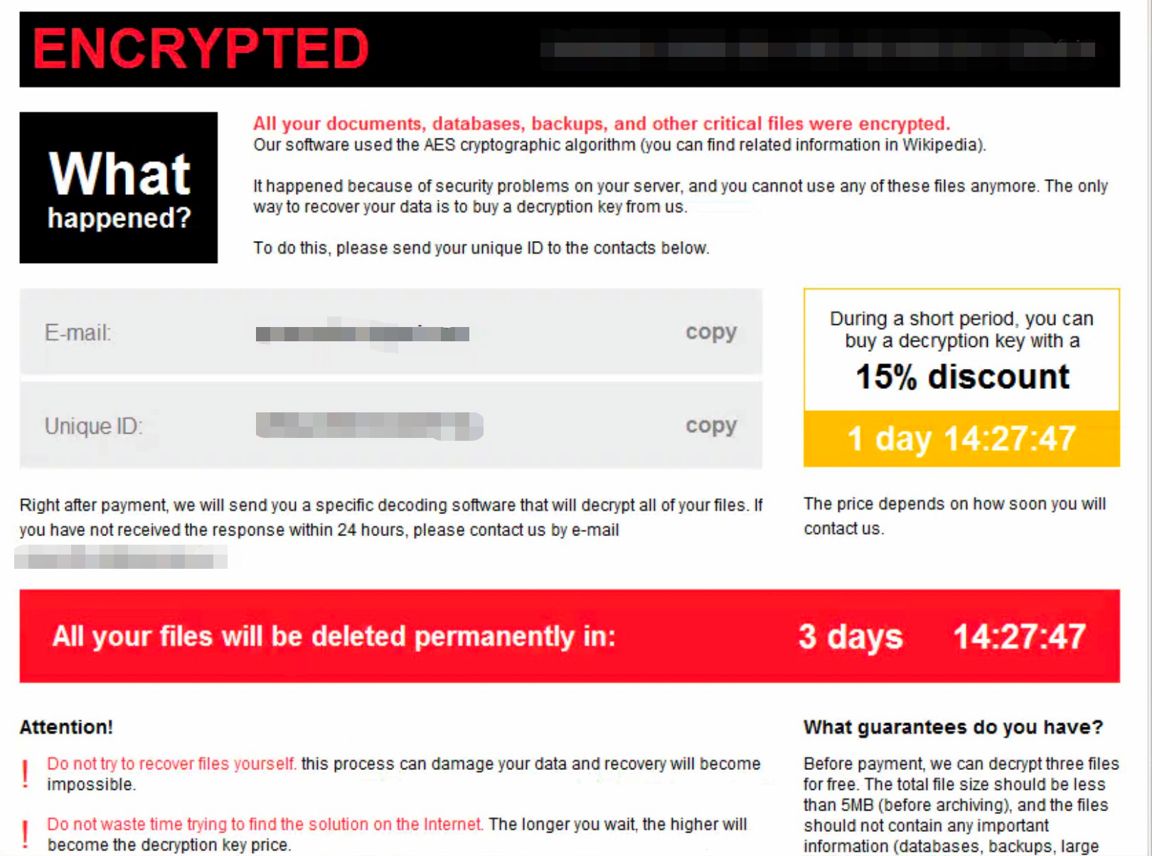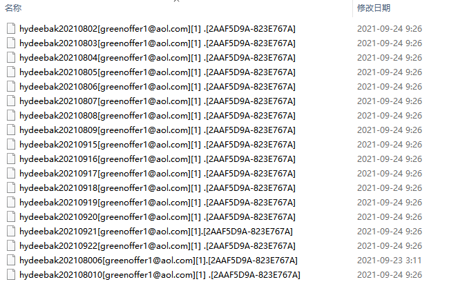 9月23日,我司接到贵阳某医药集团的求助电话,该集团hydee医药管理ERP系统的数据库文件被勒索病毒加密,中毒后的文件扩展名被改为.[greenoffer1@aol.com][1].[2AAF5D9A-823E767A]。