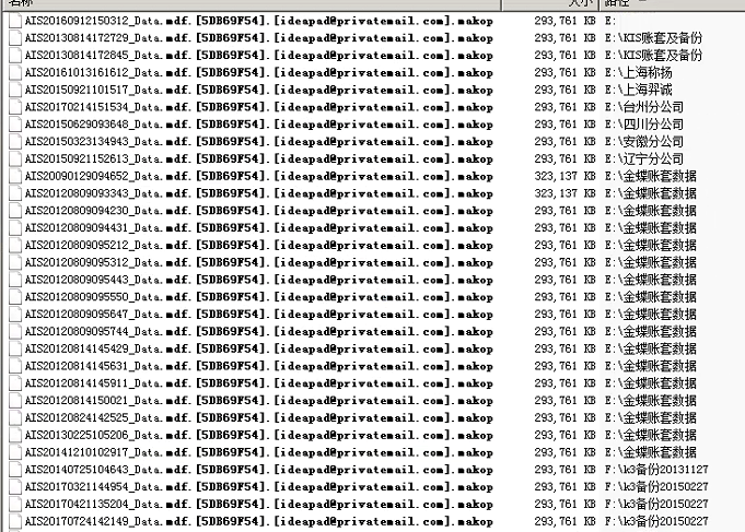 2021年10月19日,我司接到上海某集团的求助电话,称其金蝶财务系统被黑客攻击,所有账套数据都被加密。在原始文件名的基础上加了 [ideapad@privatemail.com].makop的后缀。