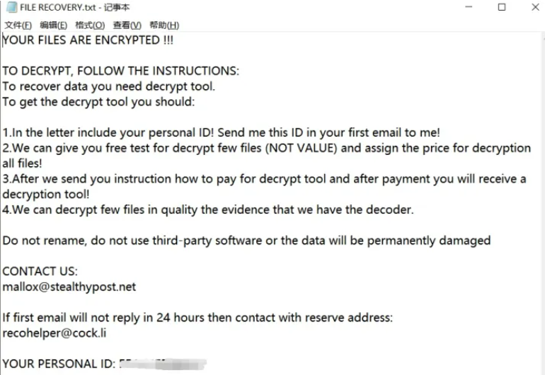 当我们的计算机电脑被.fargo后缀的勒索病毒攻击后,每当我们启动一个样本时,它都会加密文件,并在文件名后面附加“.fargo”的扩展名,如:1.jpg,会更改为1.jpg.fargo,2.jpg会更改为2.jpg.fargo,以此类推,并且电脑几乎处在瘫痪的状态,无法正常运行。并且文件加密过程并不会被大多数杀毒软件识别,因为加密过程是一种广泛应用的数据保护技术,也不会对文件损坏,所以杀毒软件也不会组织,以此造成全部文件被勒索病毒加密。同时黑客也会留下勒索文档FILE RECOVERY.txt,内容为包含了赎金要求,威胁信息以及购买解密工具的说明介绍。