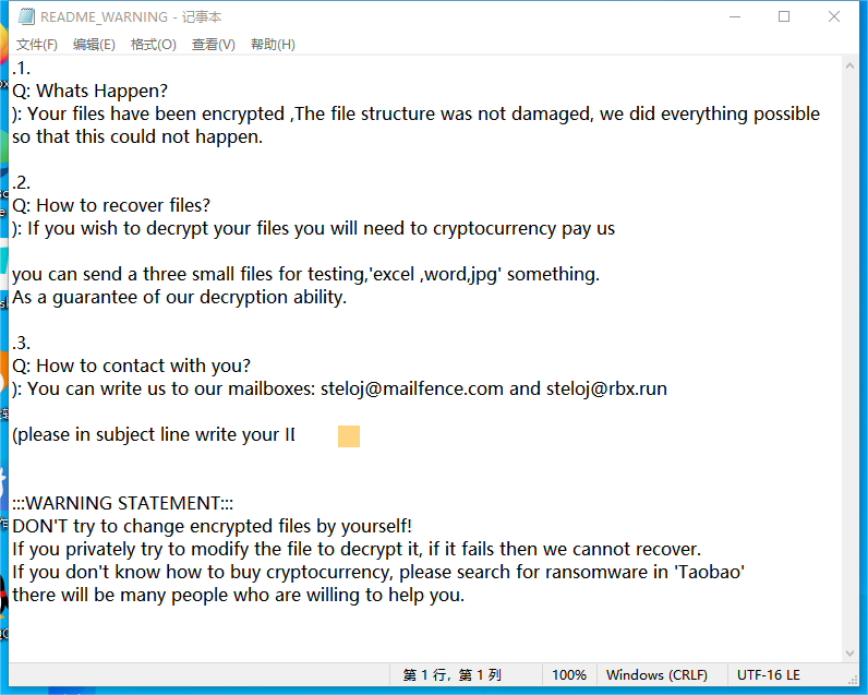- 桌面以及多个文件夹当中都有一封名为README_WARNINNG的文本文档。这个文档就是对方留下来的勒索信,目的就是简单的告知你您的服务器中招了,以及怎么样恢复您的数据等信息。