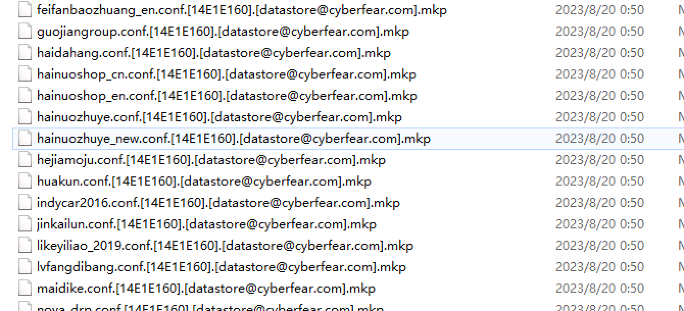 - 所有文件的扩展名都变成了*[XXXXXXX][XXXXXX].mkp 比如原来文件的名称是doc,中招后则会变成kuaijiemi.doc.[XXXXXXX][XXXXXX].mkp。其中第一个【】中是一串包含有数字和大写英文字母组成的随机字符串;第二个【】中是一个邮箱地址。
