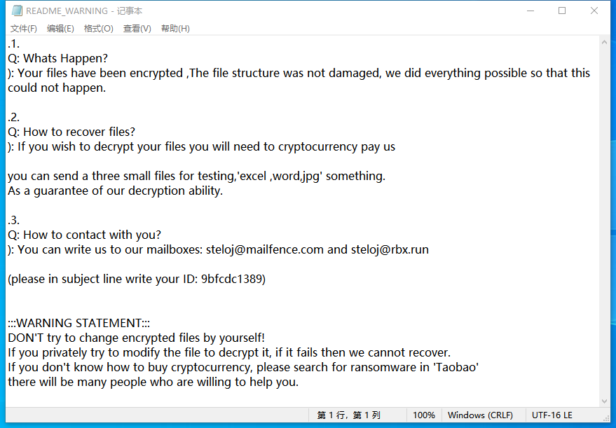 - 勒索信息:在加密文件后,mkp勒索病毒会在用户计算机屏幕上弹出一个提示框,要求用户在规定时间内支付一定数额的赎金,以解密文件。提示框中通常包含解密文件的联系方式和付款方式,如比特币等。