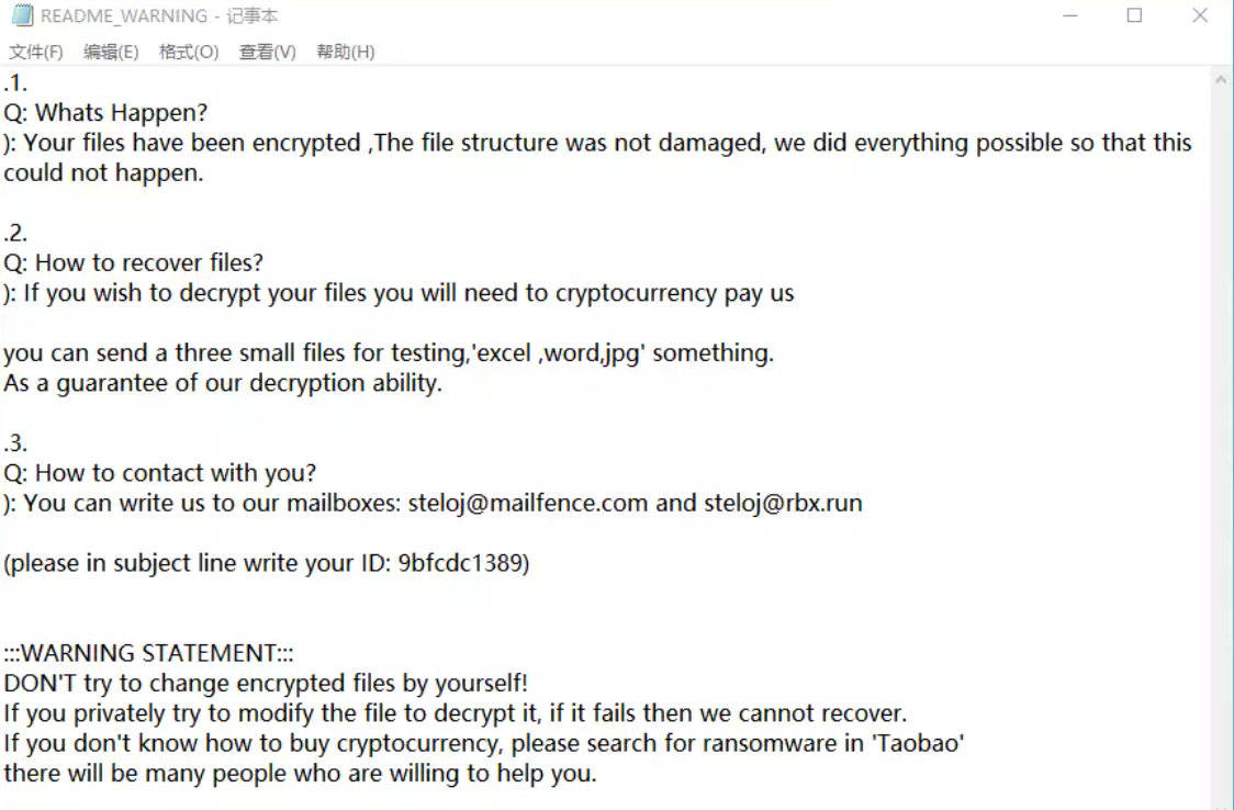 - 中毒表现,当企业计算机服务器被mkp勒索病毒攻击,计算机系统内的所有文件都将被加密,所有后缀名都将变成.mkp,像,mdf文件,就会变成kuaijiemi.mdf.[xxxx][xxxx].mkp,并且在桌面上会留有一份名为README_WARNING.txt文档的勒索信。