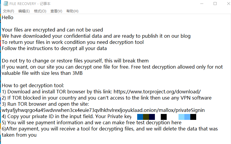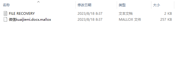 - 中毒表现,当计算机中了mallox勒索病毒后,企业计算机上的所有文件都将被加密,所有的文件后缀名统一变成.mallox,并且还会再桌面上留有一份“FILE RECOVERY.txt”的勒索文档。