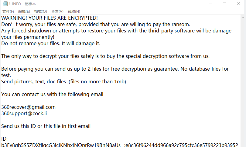 - 中毒后的表现,计算机服务器中了halo勒索病毒后,计算机几乎处在瘫痪状态,所有办公软件无法正常操作,并且计算机服务器中的所有文件的后缀名统一变成了halo,像mdf文件就会变成jiemihuifu.mdf.halo,并且还会再计算机桌面留有一封名为!_INFO的勒索信。