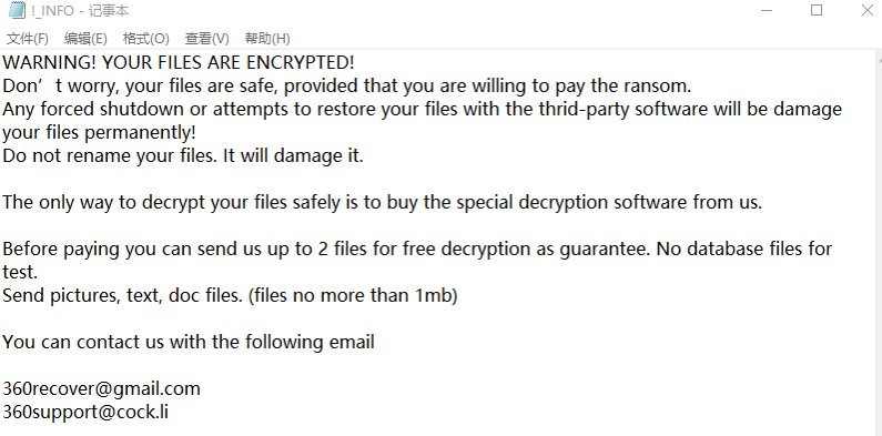 - 中毒后的表现,当计算机服务器中的文件被halo勒索病毒攻击后,计算机上的所有文件的后缀名统一变成了halo,像mdf文件,就会变成jiemihuifu.mdf.halo,并且还会计算机的桌面留有一封!_INFO的勒索信,造成计算机系统瘫痪,所有办公软件无法正常使用。