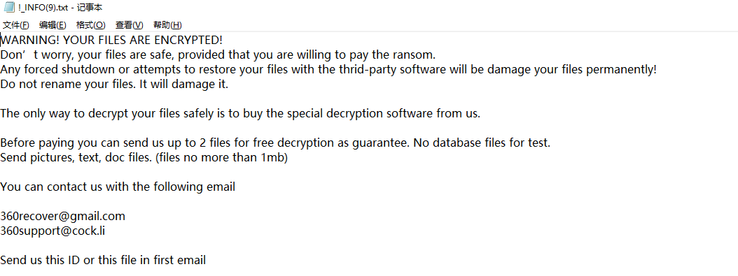 - 中毒表现,当计算机被360后缀勒索病毒攻击后,计算机上的所有文件夹的后缀名统一变成了360,并且还会在计算机的桌面留有一封名为!TXT的勒索信,要求企业在规定时间内支付相应赎金来解密数据。