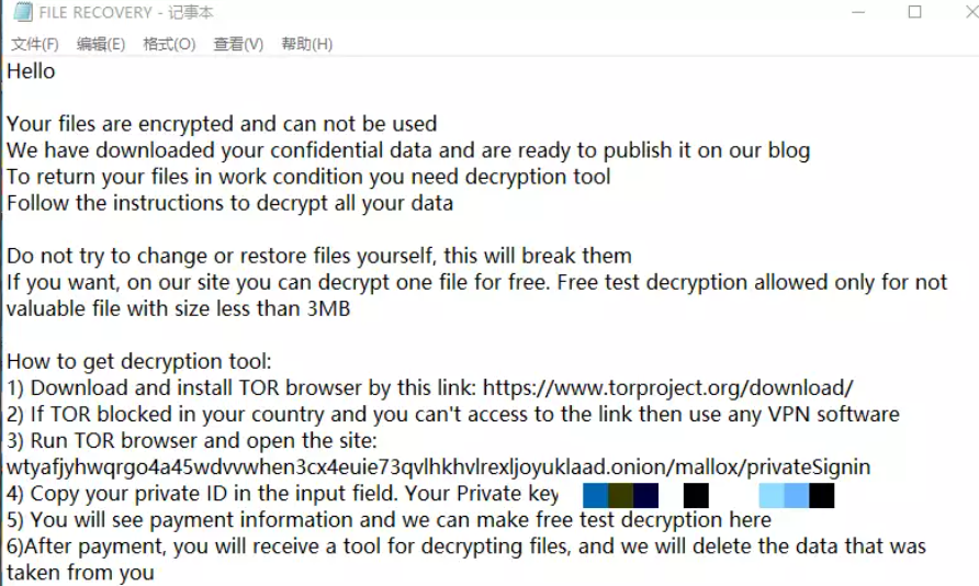 - 攻击表现,计算机服务器被mallox勒索病毒攻击后,计算机中所有文件的后缀名统一变成了mallox,并且还会在计算机的桌面上发现一封名为FILE RECOVERY.TXT的勒索信息,计算机的所有应用软件无法正常使用,数据无法调取打开。