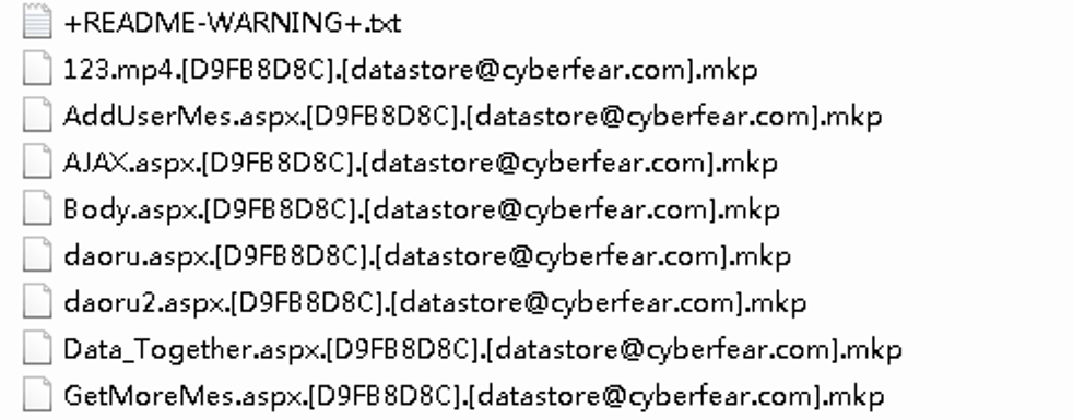 - 攻击现象,当企业计算机服务器被mkp勒索病毒攻击后,企业计算机系统几乎无法正常工作,所有文件与软件均无法打开正常使用,并且所有文件都会变成统一格式,像mdf文件就会变成jiemihuifu.[id].[黑客邮箱].mkp,并且还会在计算机的桌面留下一封名为+README-WARNING+.txt勒索信息。