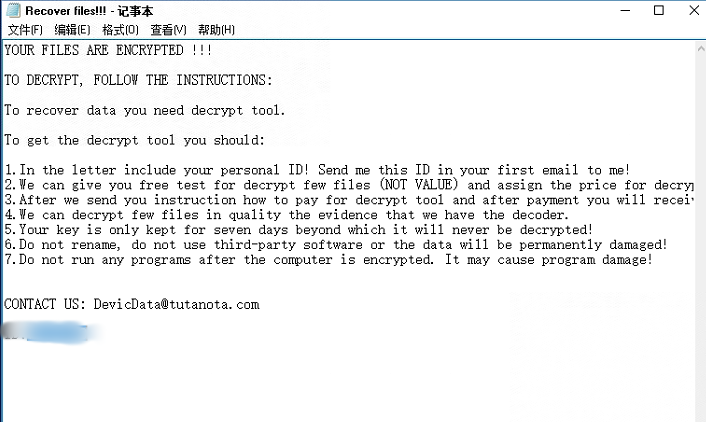 - 中毒特点,当发现计算机服务器被devicdata勒索病毒攻击后,企业计算机上的所有文件后缀名统一变成了devicdata,像mdf文件就会变成jiemihuifu.mdf.devicdata.x-xxxxxx,并且还会计算机桌面与所有扇区留下一封名为Recover files!!!.txt的勒索信。