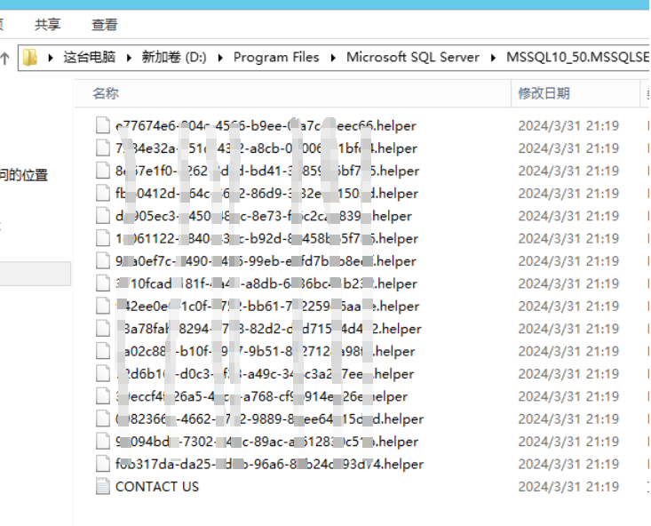 - 中毒表现,当计算机服务器被helper勒索病毒攻击后,计算机内部的所有文件的后缀名统一变成了helper,并且还会再计算机桌面和所有文件夹内留下一封名为CONTACT US的勒索信,要求企业在规定时间内联系,以获取解密方案。