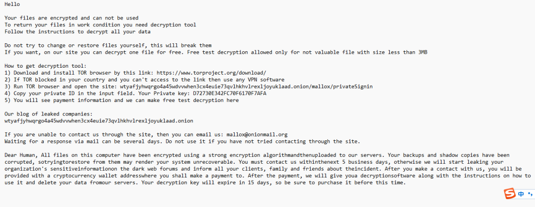 - 攻击加密,mallox勒索病毒近期升级了加密算法,该勒索病毒具有较强的攻击与加密能力,它能够绕过各种企业防护软件,一旦企业被该勒索病毒攻击,非专业技术人员很难自行解密恢复。