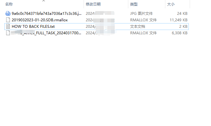 - 攻击表现,rmallox勒索病毒攻击企业计算机服务器后,企业计算机服务器中的所有文件的后缀名统一会变成rmallox,像mdf文件,就会变成jiemihuifu.mdf.rmallox,并且在计算机桌面和所有文件夹内留下一封名为HOW TO BACK FILES.txt勒索信。