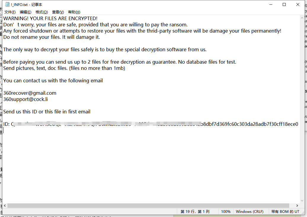 - 攻击影响,360后缀勒索病毒会给企业带来严重的经济损失,并且还会造成企业计算机系统瘫痪无法正常使用,使的企业重要信息遭到泄露的风险,影响企业的正常业务开展,进而给企业的信誉与口碑带来恶劣影响。