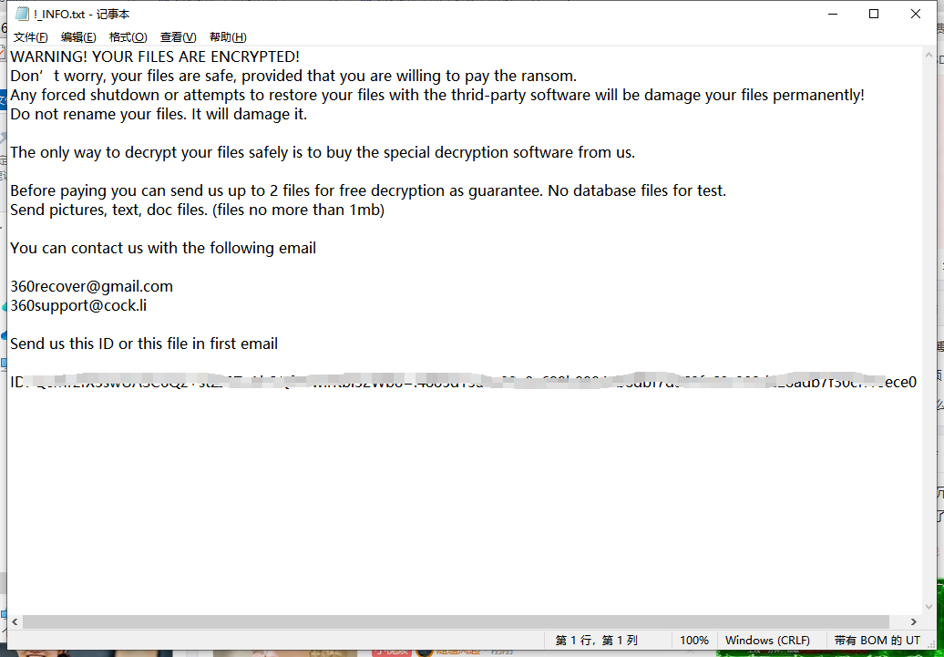 - 攻击表现,当企业计算机服务器被360后缀勒索病毒攻击后,企业计算机上的所有文件与软件均无法正常打开使用,并且所有文件的后缀名都会变成360,并且还会在计算机桌面留下一封名为!_INFO的txt或html勒索信。