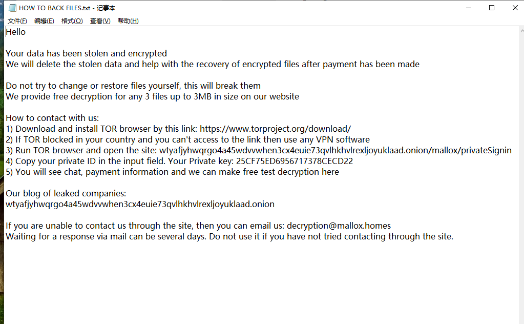 - 细节注意,由于rmallox勒索病毒攻击企业的类型较为广泛,并且还会给企业带来严重的经济损失,企业不要尝试自行解密恢复,不要尝试修改文件后缀名或利用网络上的解密工具进行尝试解密,这些操作一定是解密不成功的,还会破坏底层加密逻辑,为后期的解密工作带来困难,从而增加解密恢复成本。