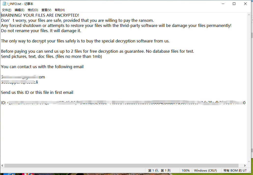 - 攻击表示,当计算机服务器被360后缀勒索病毒攻击后,企业计算机服务器中的所有文件软件均无法正常打开使用,并且所有文件的后缀名都会变成统一的360格式,并且还会在计算机桌面留下一封名为!_INFO的txt或html勒索文件。