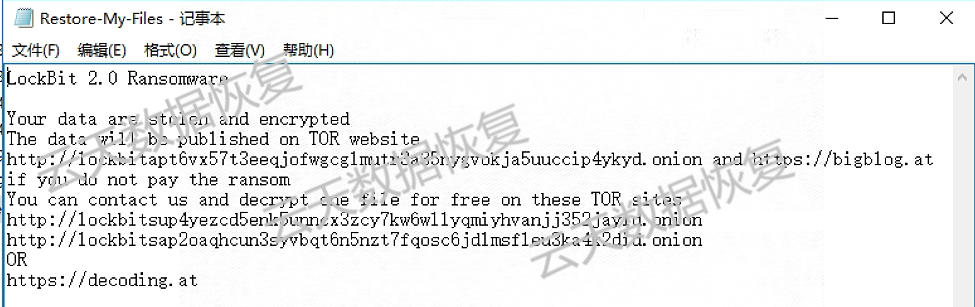 首先,我们需要了解LockBit 2.0/3.0勒索病毒。LockBit 2.0/3.0勒索病毒是一种新型的勒索软件,采用RSA-2048和AES-256等加密算法对文件进行加密,使用户无法访问自己的文件。攻击者会向受害者发送勒索信息,要求支付比特币等虚拟货币来解密文件。此外,该病毒还会在受害者电脑上留下一个“Restore-My-Files.txt”文件,其中包含攻击者的联系方式和支付说明。